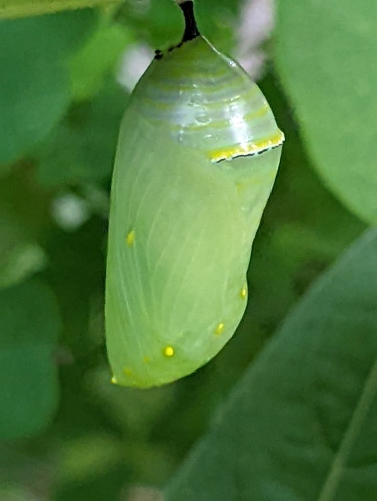 Outdoors, the curled caterpillar became a chrysalis. He is hanging beneath a milkweed leaf on the Hellstrip.