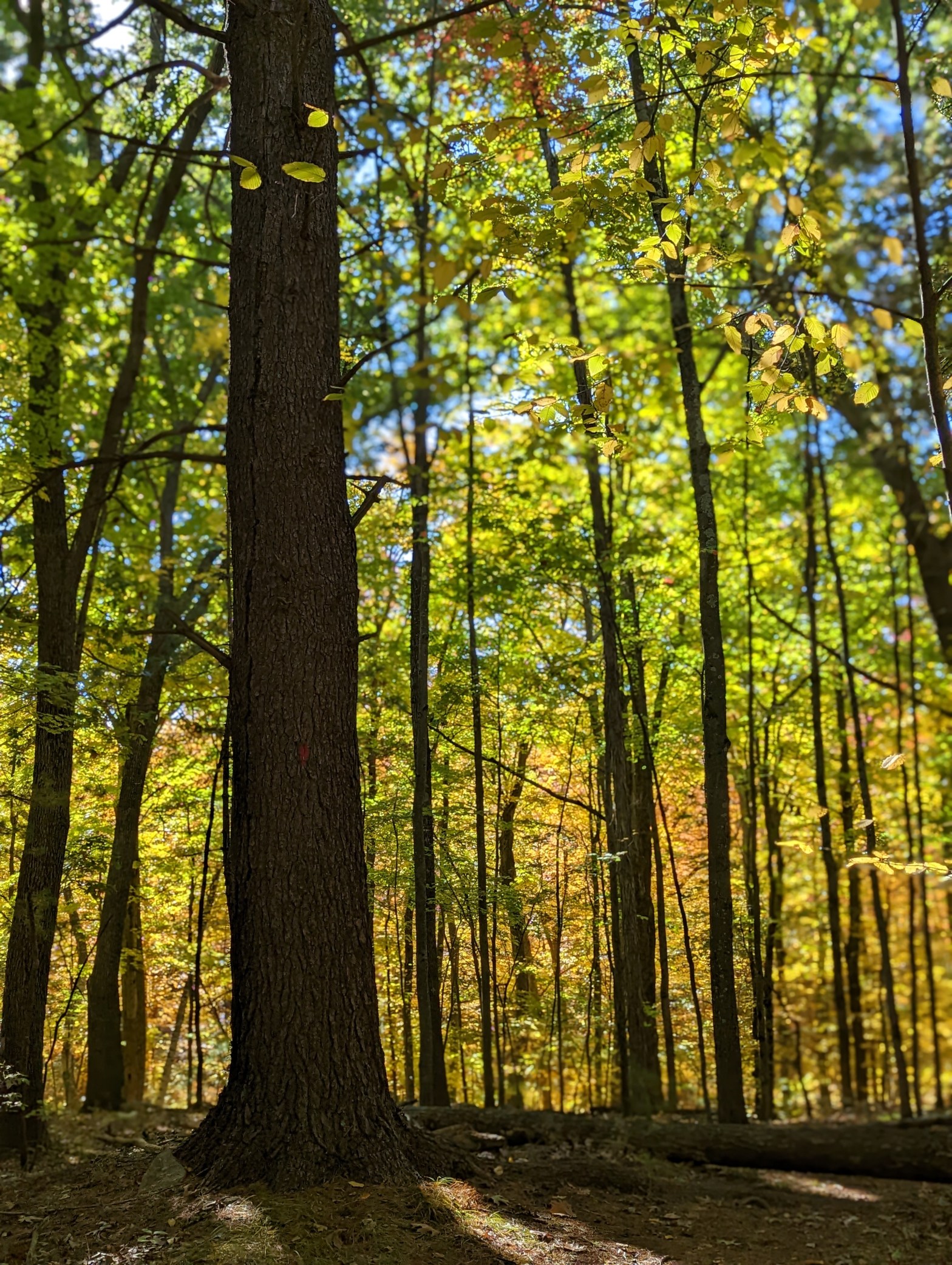 The trail begins with a rather steep decline into the woods. Although this is a residential area of the city, upon entering the woods, I felt like I was transported to quiet sylvan glen. The path follows an old stone wall, that was built colonial farmers. Sunlight dappled golden beech leaves.
