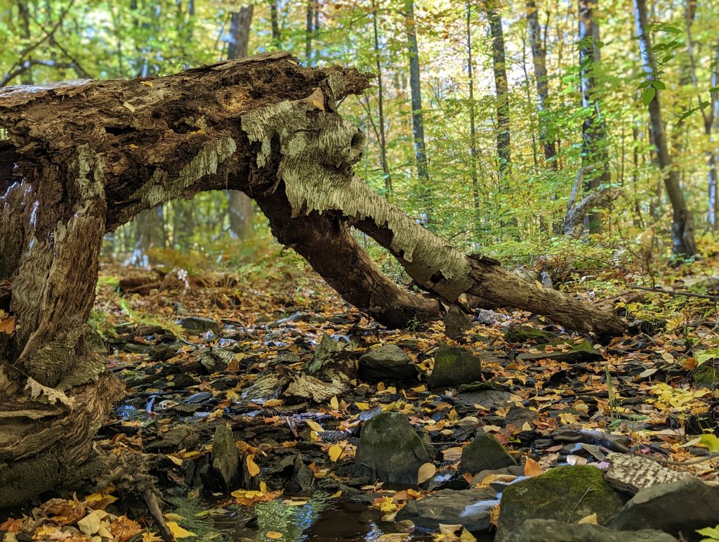 A larger stream could be crossed by a rocky weir. Golden leaves playfully glided atop the rivulets and small waterfalls. A fallen tree evoked images of a primeval time when Woolly Mammoths lived here.