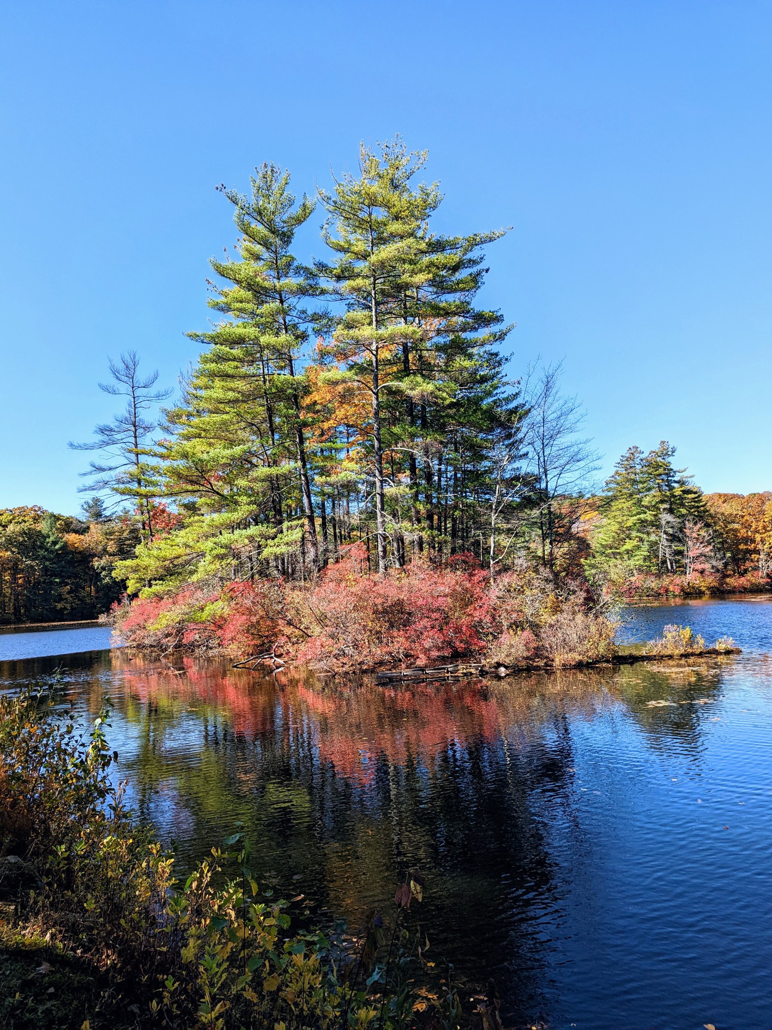 The trail hugs the edge of Cook’s Pond. This pond was created in 1830 by Samuel Flagg. We traversed Flagg’s dam. To the right of the dam, there is a steep drop with a craggy waterfall. To the left, there are stunning views of the placid pond. On this day, the image of bright foliage was heightened by their copper, gold, and crimson reflections.