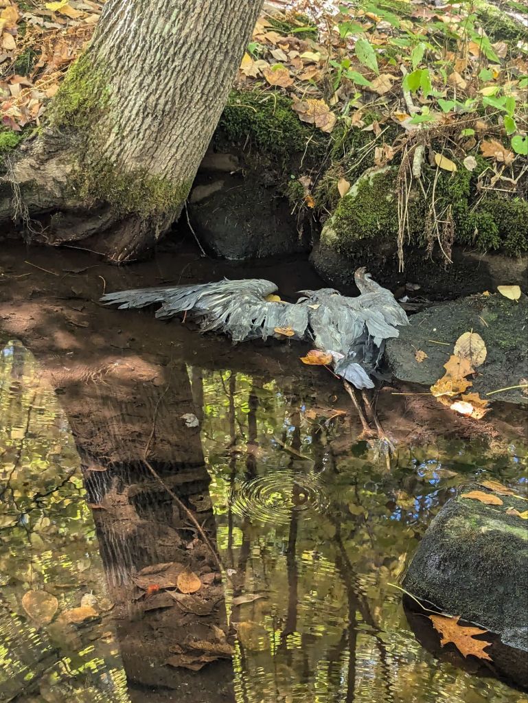 I saw the lifeless body of a Great Blue Heron floating in the stream.