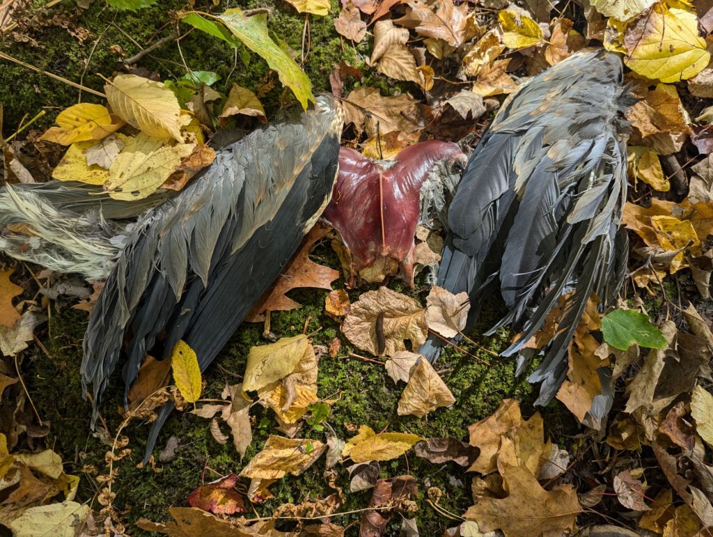 I dug a grave off of the path, by a mossy stone. The soil was dark, and rich. I lined the hole with ferns and fall leaves. I gently placed the heron’s lifeless body within the earth and composed a eulogy.