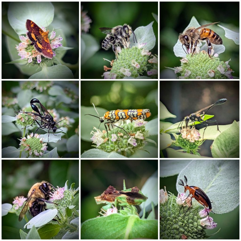 Pycnanthemum muticum, or Mountain Mint has strong powers of attraction. A diverse crowd of critters can be found on its flowers. Under the sun, this plant hums with activity.