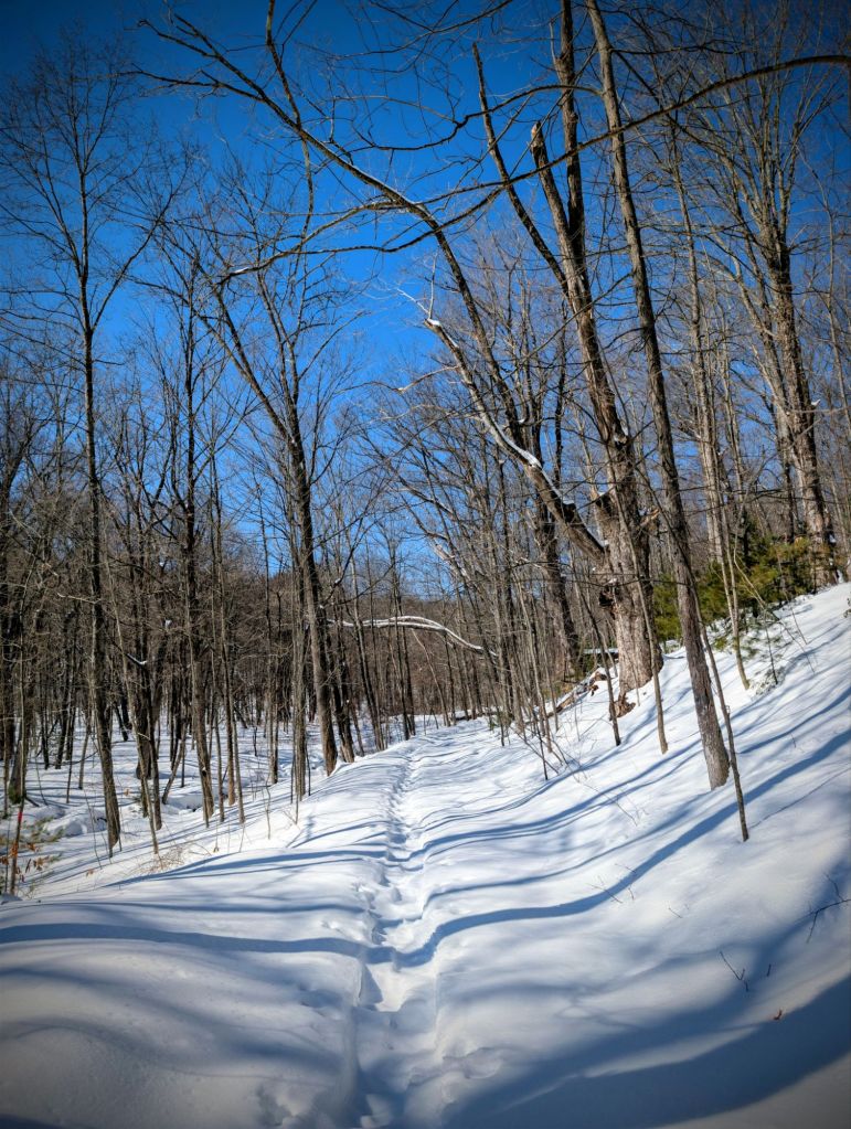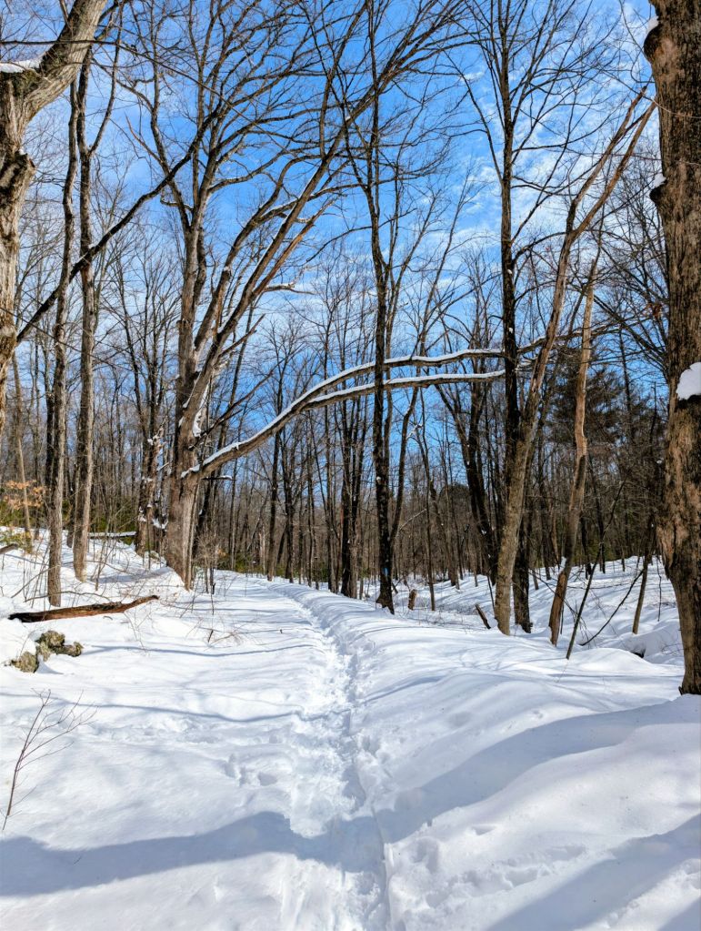 I only had a brief hour to myself, so I headed to Nick’s Woods. I parked on Stetson Road, crossed the street, and headed down Smith Lane. The trailhead was a mountain of plowed snow.