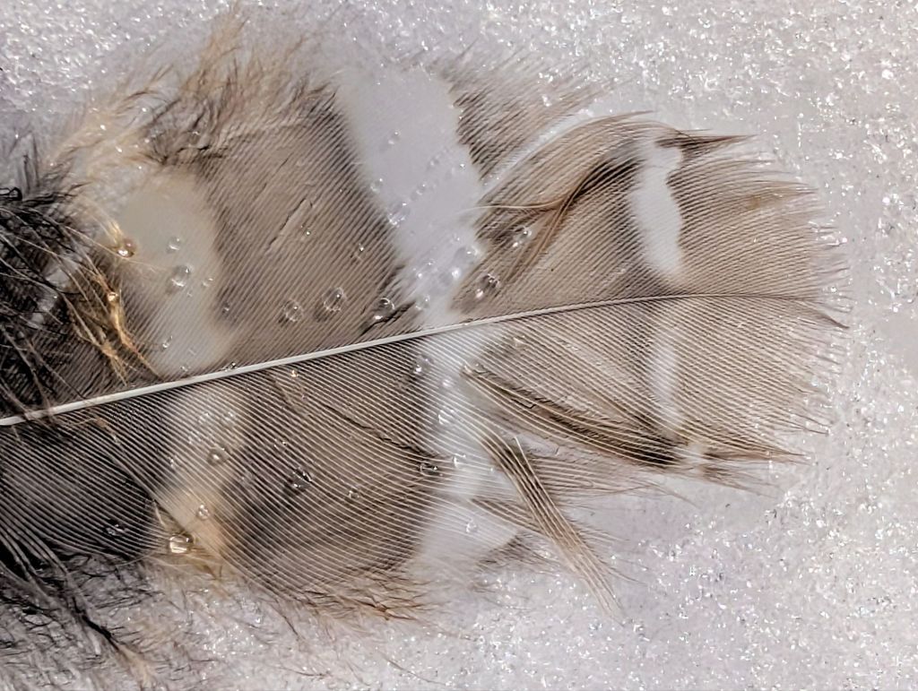 A single feather lays in the snow – a reminder of our majestic raptors. Beads of water shine on its surface.