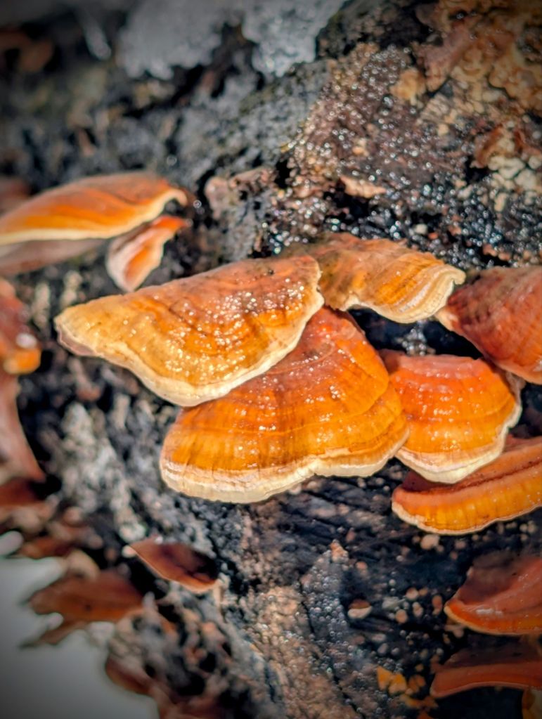 A flash of intense orange – complementary color to the blue skies and shadow. Turkey tails on a log.